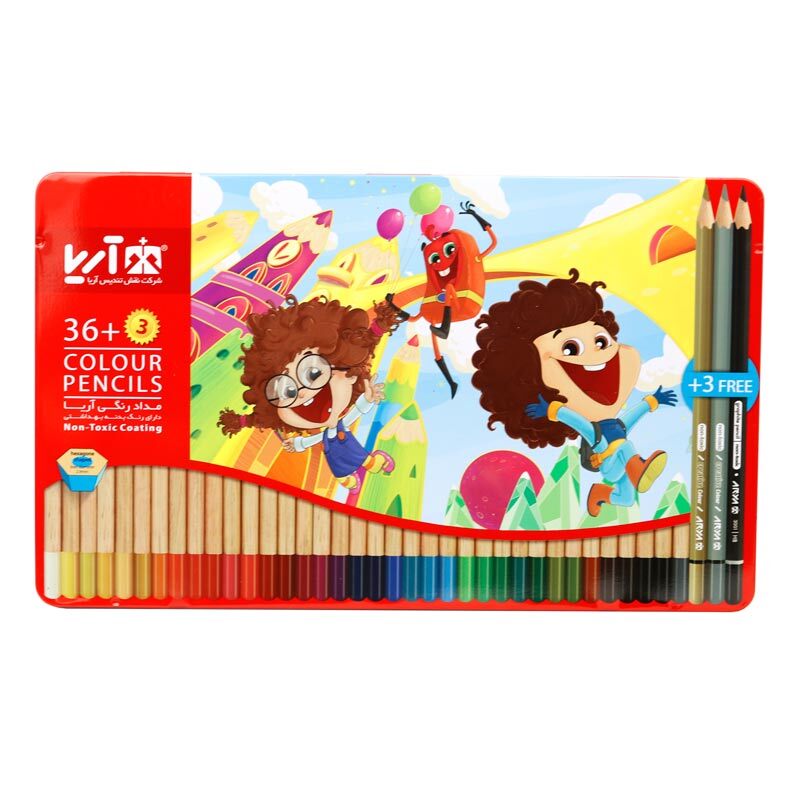 سه مداد اضافی شامل یک مداد رنگی نقره ای، یک مداد مشکی تحریر و یک مداد رنگی طلایی بدنه ی مقاوم از جنس چوب با کیفیت و رنگ بهداشتی، با سطح مقطع شش ضلعی قطر مغزی ۲٫۹ میلی متر، امکان تراشیدن آسان و رنگ های شارپ و درخشان غیر سمی، مناسب نقاشی کودکان، بزرگسالان، کاربران مبتدی و حرفه ای تعداد ۳۹ رنگ ( ۳۶+۳ ) در جعبه ای فلزی با طرح های زیبا و متنوع نوک مداد نرم، پر رنگ و روان با مقاومت بالا در برابر شکستگی دارای استانداردهای CE و ISO 10002:2014